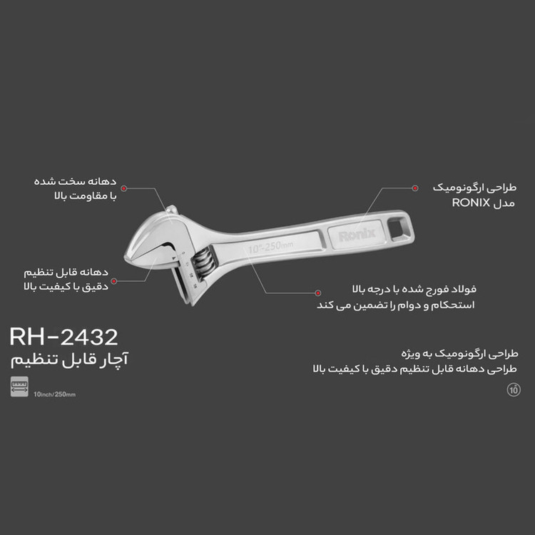 با طول 25 سانتی متر (10 اینچ)، ساخته شده از استیل فورج شده درجه بندی شده بر اساس میلی متر، حداکثر میزان باز شدن دهانه 30 میلی متر فک قابل تنظیم جهت شل یا سفت کردن انواع پیچ و مهره ها، مقاوم در برابر خوردگی