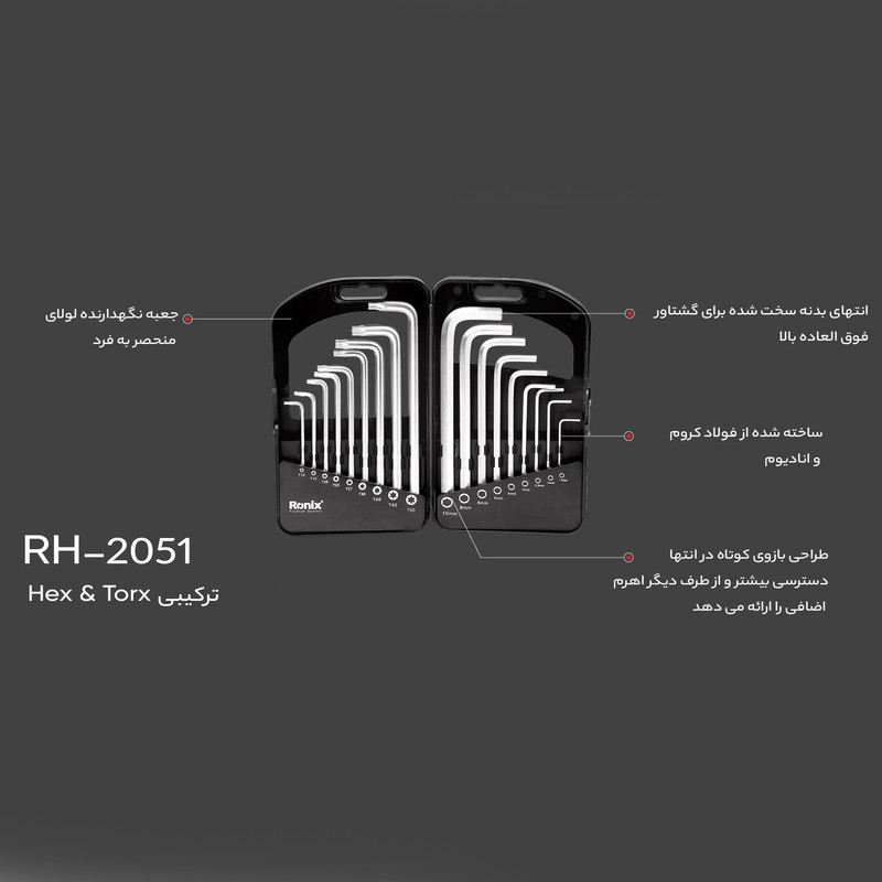 شماره آچار: 1.5 , 10 , 2 , 2.5 , 3 , 4 , 5 , 6 , 8 , T-10 , T-15 , T-20 , T-25 , T-27 , T-30 , T-40 , T-45 , T-50