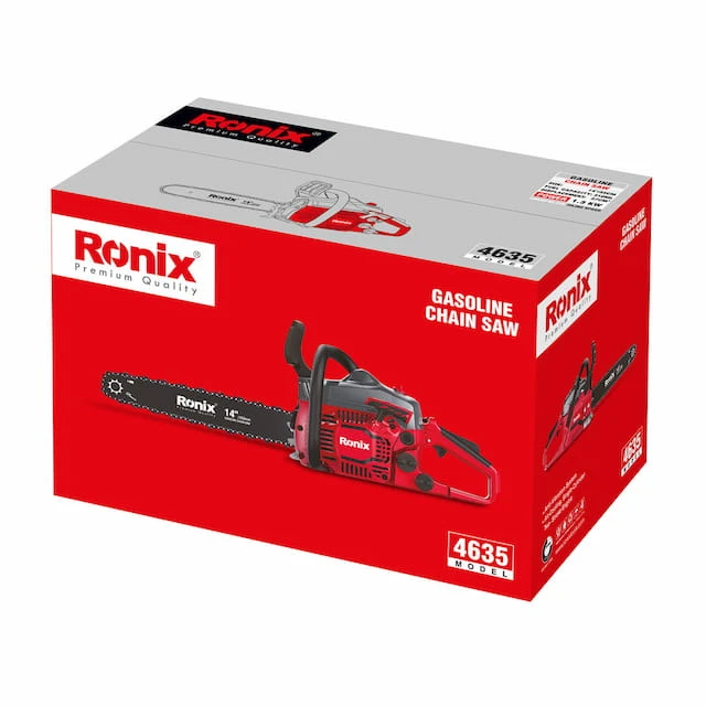 اره درخت بر بنزینی 4635 رونیکس از یک موتور درون سوز یا احتراق داخلی دو زمانه به عنوان مولد نیرو استفاده می کند. موتورهای درون سوز در دو نوع چهار زمانه و دو زمانه وجود دارند که چهار زمانه ها عموما در ساخت اتومبیل ها بکار گرفته می شوند و دو زمانه ها در ساخت ابزارآلات بنزینی... مزیت اصلی این اره نسبت به سایر اره های درخت بر بنزینی، استفاده از کاربراتور با کیفیتی است که میزان ترکیب هوا با روغن و بنزین را با دقیق ترین اندازه گیری ممکن انجام می دهد و طول عمری بسیار بالا دارد. به علاوه وجود پمپ ثانویه برای پمپاژ سریع تر بنزین و روغن به داخل موتور، ساسات برای بستن دریچه هوا و تجمع بنزین بیشتر برای ایجاد احتراقی قوی تر در موتور و هندل برای سرعت بخشیدن به حرکت خطی پیستون داخل سیلندر، از جمله عواملی هستند که استارتی سریع تر و آسان تر را برای 4635 مخصوصا در هوای سرد و برای راه اندازی اولیه به وجود می آورند. موتور این محصول با حجم 37 سی سی قادر به تولید توانی 1300 واتی و تولید سرعتی بالغ بر 3000 دور در دقیقه است که با گشتاوری بالا برش سخت ترین تنه ها را در چند ثانیه و به بهترین شکل ممکن امکان پذیر خواهد کرد. اره درخت بر بنزینی 4635 رونیکس مجهز به سیستم ترمز اضطراری است که در قسمت جلویی اره قرار گرفته و با قطع اتصال بین کلاچ و زنجیر از حرکت زنجیر در مواقع اضطراری جلوگیری می کند. به این ترتیب از بازگشت اره به سمت صورت کاربر جلوگیری شده و از سلامتی او محافظت می شود. مجهز به موتور قدرتمند 1300 واتی دو زمانه با حجم 37 سیسیدارای سیستم روغن کاری اتوماتیک زنجیر که از اصطکاک میان زنجیر و ساطور جلوگیری کرده و عملکردی آسان تر و روان تر ارائه می دهدمجهز به سیستم ضد لرزش که کار با دستگاه را آسان تر می کنددارای مکانیزم منحصربفرد ترمز اضطراری برای کاهش خطر در حین عملیات برشمجهز به استارت سریع جهت سهولت کاربریدارای سیستم احتراق جدید که باعث عملکرد هر چه روان تر دستگاه می شود طراحی ویژه اگزوز باعث کاهش مصرف سوخت و به حداقل رساندن میزان انتشار دود می شود طراحی جدید در سیستم کلاچ منجر به عملکرد بهتر و کارایی بالاتر می شود