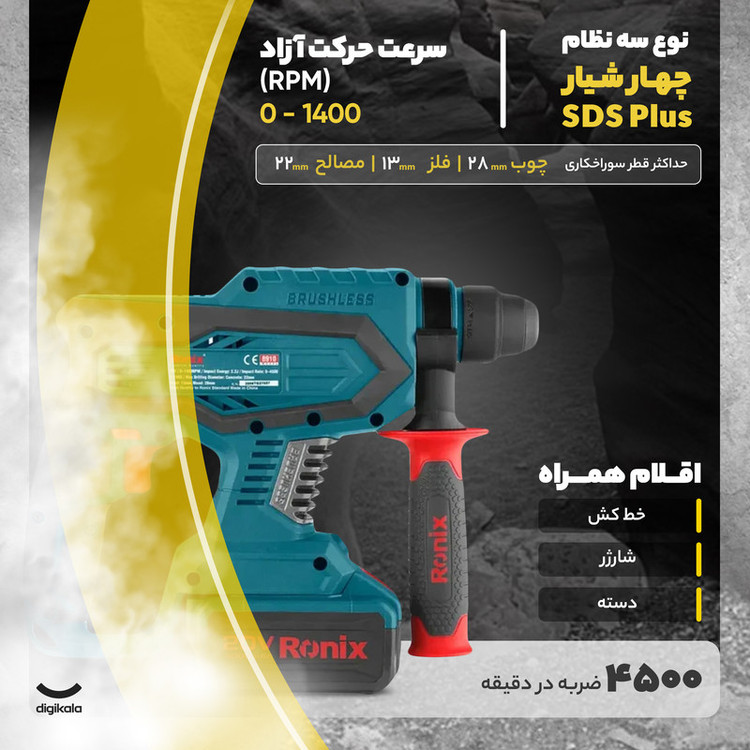 سیستم سهنظام این بتن کن از نوع حرفهای SDS Plus یا چهار شیار است که تعویض سریع و ایمن مته و قلم را ممکن میسازد. از ویژگیهای کاربردی آن میتوان به قابلیت کنترل سرعت، سیستم گردش چپگرد و راستگرد و قفل سوییچ برای استفادههای مداوم اشاره کرد. این دریل بتن کن ساخت کشور چین، با وزن تنها ۱.۹ کیلوگرم، ابزاری سبک و خوشدست برای کار در شرایط مختلف است. به همراه این محصول، اقلامی مانند دسته کمکی، خط کش عمقسنج و شارژر نیز ارائه میشود. در نهایت، دریل بتن کن رونیکس 8910 برای متخصصانی که به دنبال قدرت، دوام و آزادی عمل در محیط کار خود هستند، یک انتخاب بینقص است.
