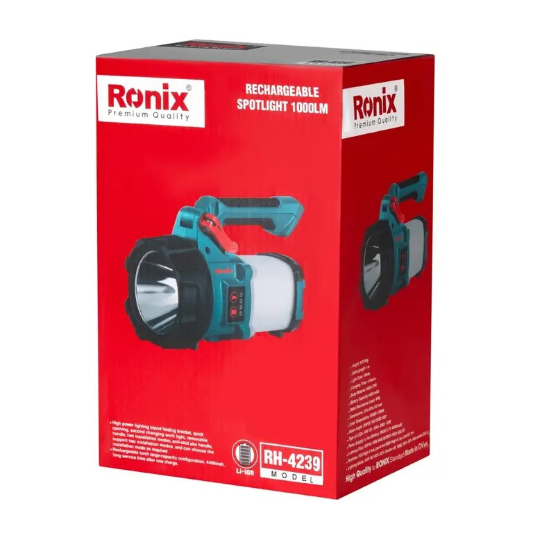 نورافکن شارژی 1000 لومن رونیکس مدل 4239R͏H͏-1000LM با استفاده از باتری لیتیوم یون با ظرفیت بالا، 4400 میلی آمپر ساعت، مدت زمان طولانی را می توان پس از یک بار شارژکردن از این نور افکن استفاده کرد. با استفاده از سه پایه جمع شونده، امکان باز شدن سریع، چراغ کار تعویض دوم، دسته تاشو، دو حالت نصب، دسته روکش لاستیکی ضد لغزش، پشتیبانی از دو حالت نصب و امکان انتخاب حالت نصب را فراهم می آورد. نگهدارنده لامپ را می توان آزادانه تغییر داد، نگهدارنده لامپ COB قابل حمل می تواند 180 درجه بچرخد، نگهدارنده لامپ دوار می تواند 180 درجه به جلو و عقب بچرخد، روشنایی این نورافکن تمامی زوایای تابشی را پوشش می دهد، زاویه آن را می توان آزادانه تنظیم کرد و گیره آن را محکم کرد. این نورافکن چند منظوره می تواند سطح باتری را در هر لحظه نشان دهد. نمایشگر سطح توان باتری چهار وضعیت(25٪ - 50٪ - 70٪ - 100٪) را نشان می دهد. می توانید از این نورافکن به عنوان پاوربانک با پایه ی مگنتی استفاده کنید. نورافکن شارژی 1000 لومن رونیکس مدل 4239R͏H͏-1000LM، نور کافی را برای کار در فضاهای تاریک فراهم میکند و در حین روشنکردن فضای خانه، فضاهای باز و ... عملکرد ایدهآلی دارد. این نورافکن شارژی، شار روشنایی 1000 لومن را تامین کرده و مجهز به چراغهای الایدی XHP50 و SMD است. بدنه این ابزار روشنایی از جنس پلاستیک ABS و TPR بوده و با وجود مقاومت بالا، قابلیت حمل و نگهداری آسانی نیز دارد. سهپایه جمعشونده، قابلیت بازشدن سریع، چراغ کار تعویض دوم، دسته تاشو، دو حالت نصب، دسته روکش لاستیکی ضد لغزش، پشتیبانی از دو حالت نصب و امکان انتخاب حالت نصب، از مهمترین مزایای این نورافکن شارژی حرفهای هستند.