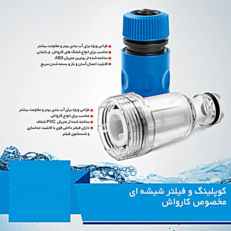 این محصول یک عدد فیلتر شیشه ای ورودی کارواش با سایز 2/5 سانت یا 3/4 اینچ می باشد که به همراه کوپلینک فشاری مخصوص سر شیلنگی عرضه شده است.ابتدا فیلتر را به کارواش متصل میکنید و سپس این کوپلینگ به سر شیلنگ متصل میشود و برای هر بار استفاده جهت اتصال شیلنگ به کارواش به راحتی کوپلینگ را به فیلتر نصب شده بر روی کارواش فشار میدهید.برای باز کردن کوپیلنگ از فیلتر می بایست سر کوپلینگ را به بیرون هل دهید تا ضامن کوپلینگ ازاد شود و کوپلینگ شیلنگ از فیلتر کارواش جدا گردد.این کار باعث افزایش طول عمر فیلتر جهت جلوگیری از شکستن آن میگردد.