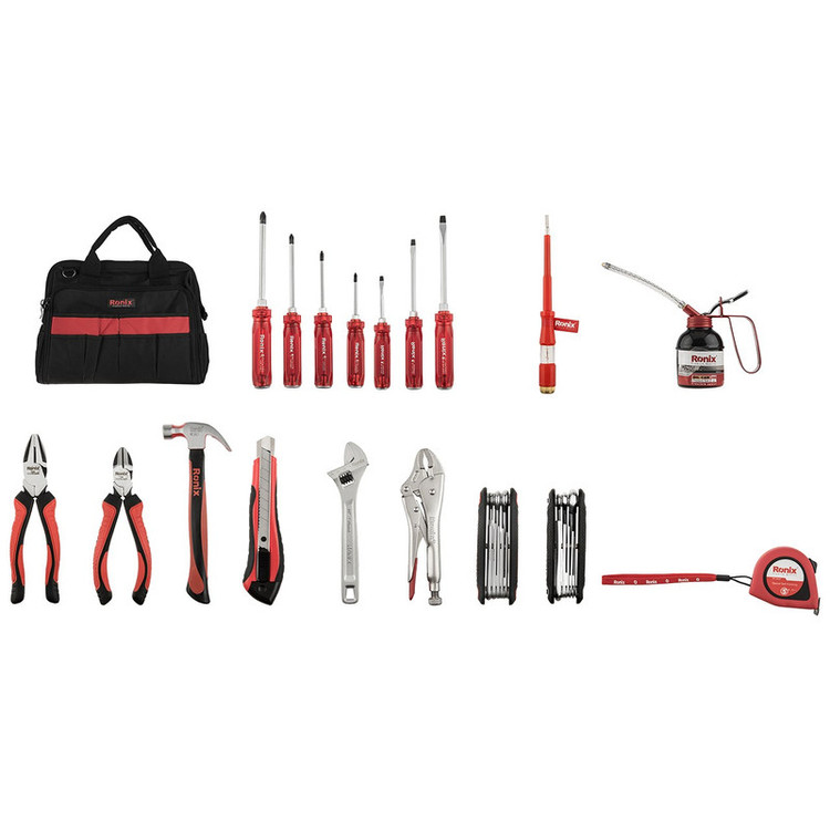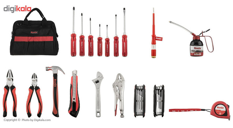اگر قصد تهیهی مجموعه ابزاری ساده و کارآمد دارید محصول فوق پاسخگوی نیازهای شما خواهد بود. این مجموعه 19 عددی از ضروریترین ابزارهای کار برخوردار است. شرکت «رونیکس» (Ronix) برای این مجموعه 3 پیچ گوشتی دوسو و 4 پیچ گوشتی چهارسو با سری آهنربایی و قابلیت کوبش پذیری درنظر گرفته است تا بتوانید بسیاری از پیچهای دوسو و چهارسو را باز و بسته کنید. برای پیچهای دیگر نیز 8 پیچ گوشتی ستارهای و 8 آچار آلن طراحی شده است. فازمتر این مجموعه طولی 18 سانتیمتری دارد و دامنه ولتاژ آن 500-100 ولت است. انبرهای این مجموعه نیز شامل سیمچین، انبردست و انبر قفلی میشوند که به ترتیب طولی برابر 16.5، 19.5 و 23 سانتیمتر دارند. از دیگر ابزارهای کاربردی که برای هر کیف ابزاری ضروری است کاتر، آچار فرانسه، متر و چکش را میتوان نام برد. شرکت رونیکس نیز به این موضوع توجه داشته است. آچار فرانسه این مجموعه 10 اینچی بوده و چکش و کاتر آن بهترتیب طولی برابر 28 و 17 سانتیمتر دارند. طول نوار متر فلزی آن نیز 5 متر بوده و از قفل، استپر و سری آهنربایی برخوردار است. برای روغنکاری قطعات نیز روغندانی فلزی با ظرفیت 200 میلیلیتر عرضه شده است. این مجموعه درون کیف ابزاری برزنتی با 35 محفظه قرار دارد که از بند و فریم فلزی دور دهانه سود میبرد.