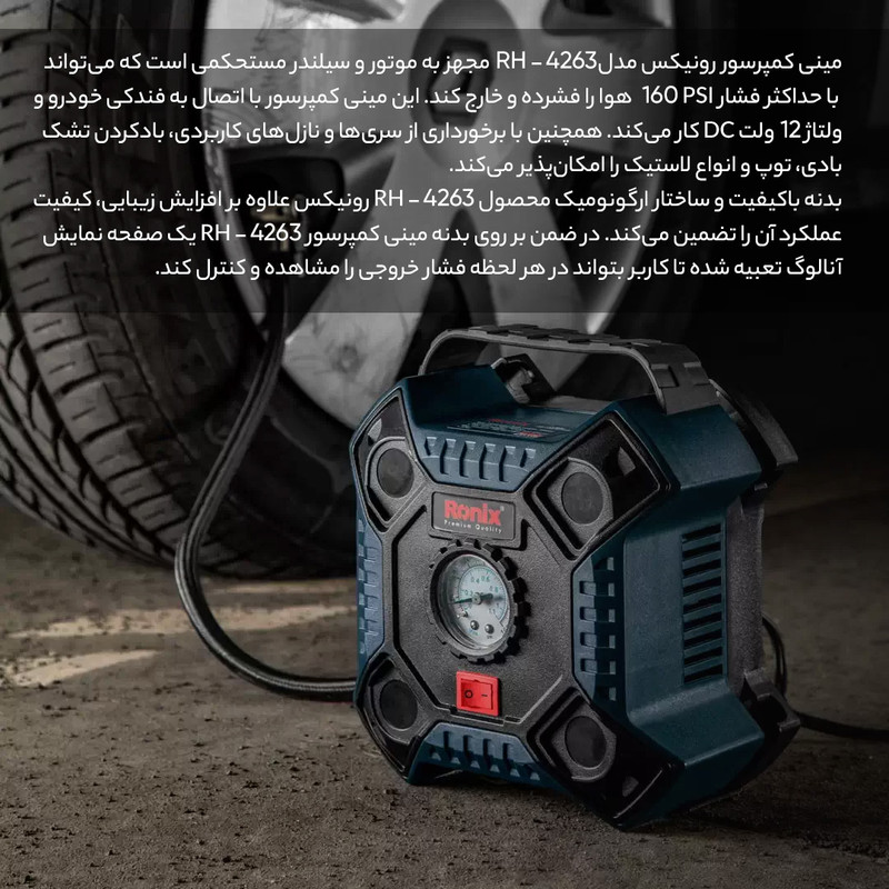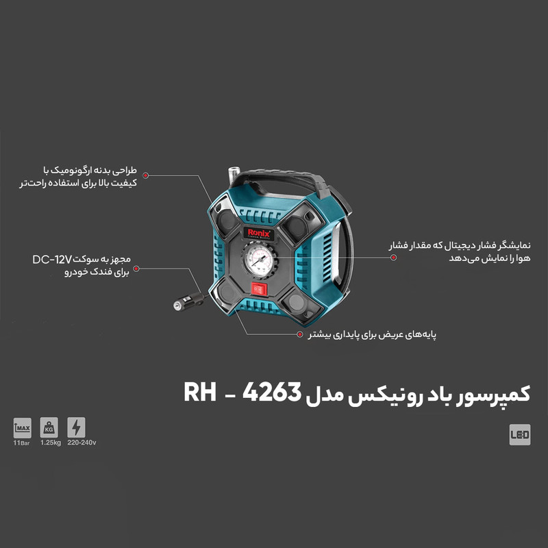 دارای چراغ LED جهت استفاده به عنوان چراغ قوه دارای محل نگهداری سیم تغذیه جهت سهولت استفاده مینی کمپرسور فندکی تک سیلندر دارای دسته لاستیکی دارای دکمه خاموش و روشن دارای دسته لاستیکی دارای سری های کاربردی