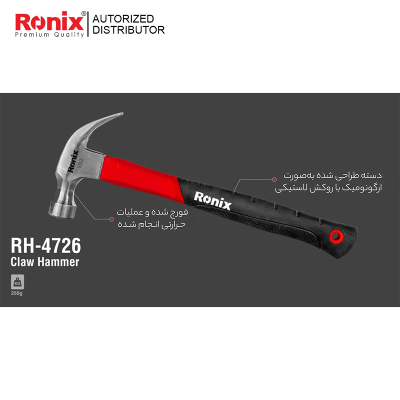 مدل محصول RH-4726 برند رونیکس یک چکش 250 گرمی است که دارای دسته ضد لغزش و ارگونومیک از جنس فایبرگلاس و همچنین روکش دسته از جنس پلاستیک ضد تعریق و قابل استفاده برای تمام مصارف (ساختمانی، نجاری، ...) میباشد .