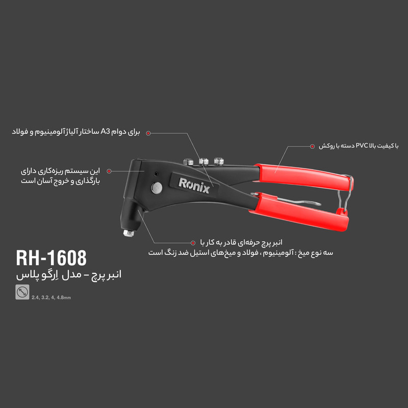 ابعاد13x13x2 سانتیمتروزن600 گرمتعداد سری4جنس بدنه کالاآلومینیوم دایکستویژگیهای انبر پرچآچار , قفل , کاوررنگقرمز