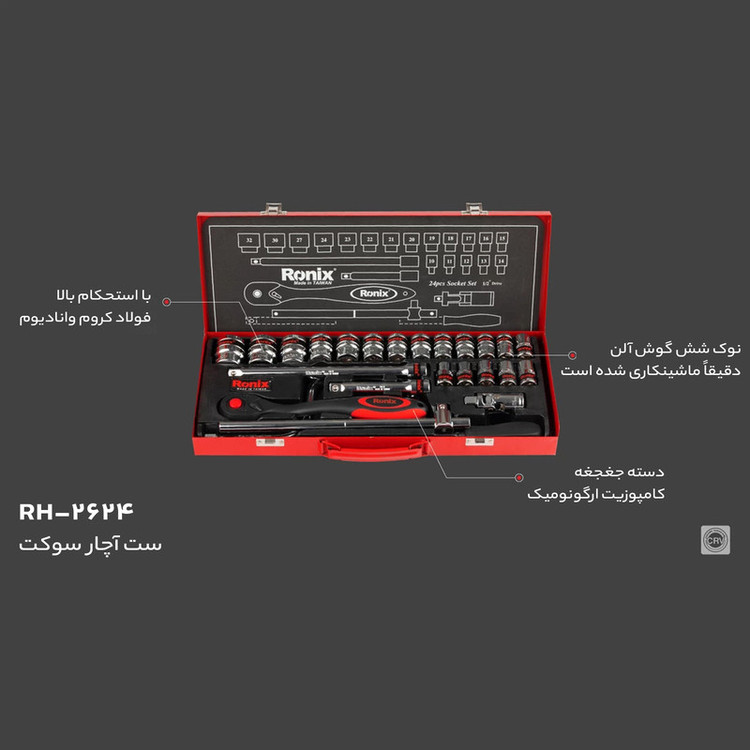 دارای بکس 16 میلی متری دارای 2 دسته کمکی 10 اینچی جغجه ی 1/2 اینچی 72 دندانه با دسته ارگونومیک دسته هندلی 1/2 اینچ دارای یک آچار لقلقه 1/2 اینچ