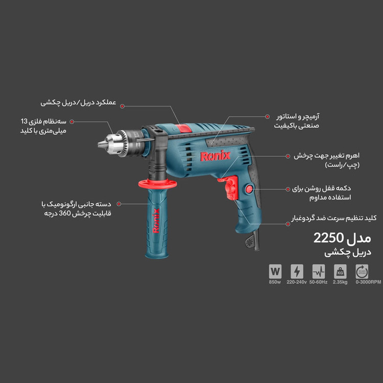 دریل برقی مدل 2250، یکی از قدرتمندترین دریلهای چکشی رونیکس، دارای موتور مقاوم و صنعتی 850 وات، طراحی ارگونومیک و پوشش خوشدست در بدنه بوده و در ساخت آن، دقت و کیفیت فوقالعاده بالایی به کار رفته است. قابلیت استفاده از این محصول در دو حالت سوراخکاری معمولی و چکشی، موتور قدرتمند 850 وات و 3000 دور، نفوذ آسان در مصالح ساختمانی بسیار متراکم چوبی، فلزی و بتنی، از مهمترین ویژگیهای این دریل چکشی منحصربهفرد هستند.