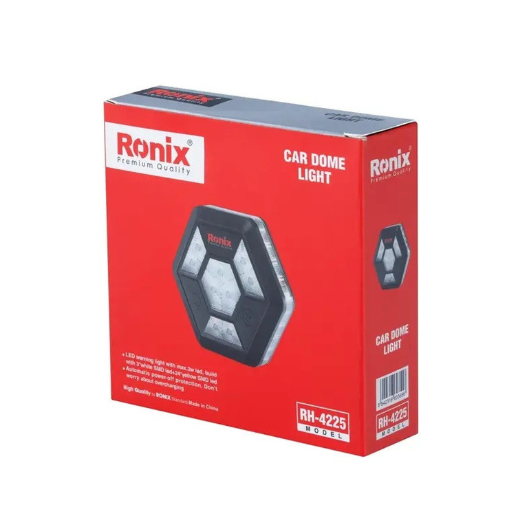 چراغ هشدار ششضلعی رونیکس RH-4225 دارای سه ال ای دی سفید SMD با شار روشنایی 30 لومن است که فضای داخلی خودروی شما را روشن میکند. همچنین، این چراغ هشدار، مجهز به 24 ال ای دی SMD زرد رنگ است که 18 عدد آن در لبه این چراغ و 6 عدد در قسمت جلوی ابزار قرار دارند. یکی از ویژگیهای اصلی این چراغ، وجود آهنربا در پشت آن است.
